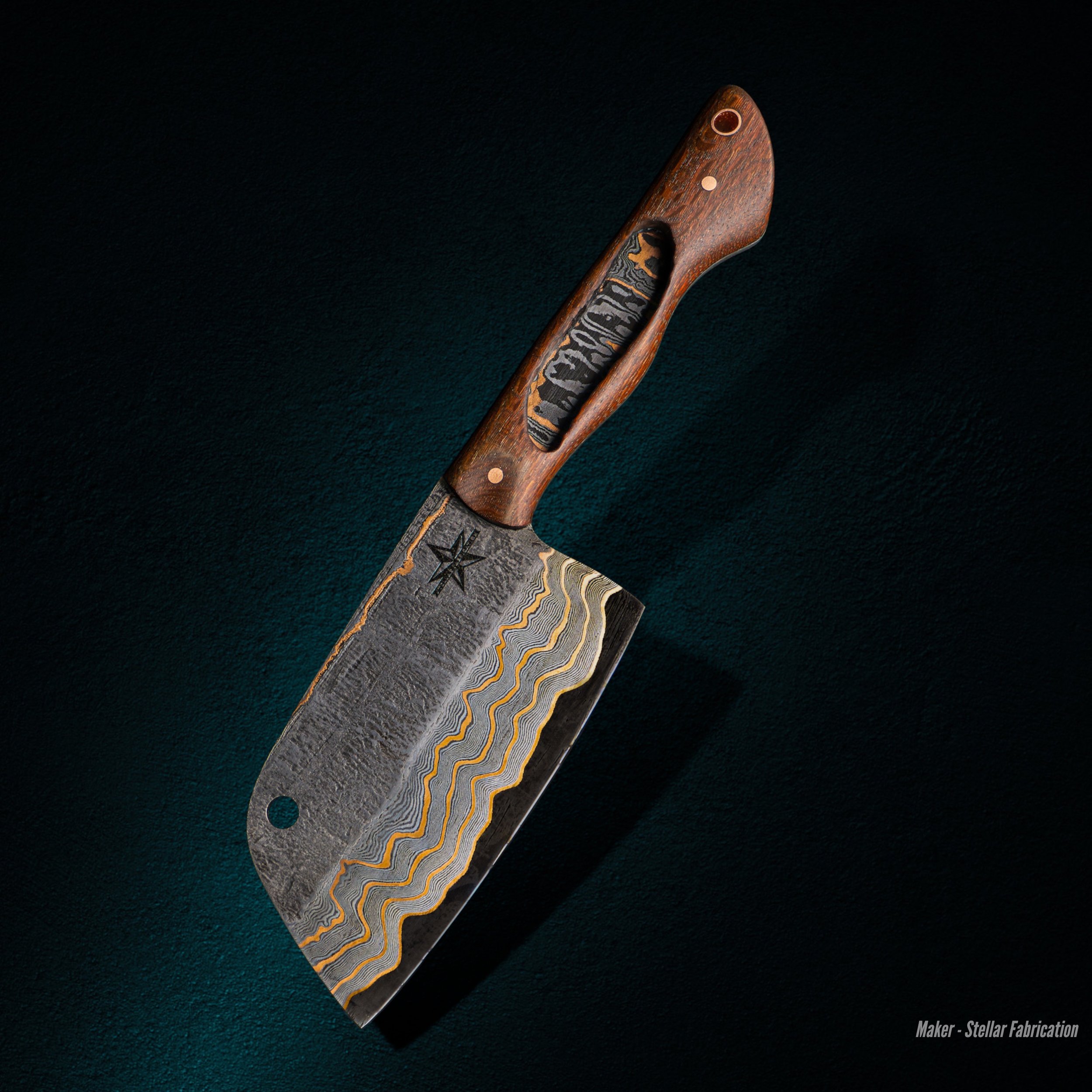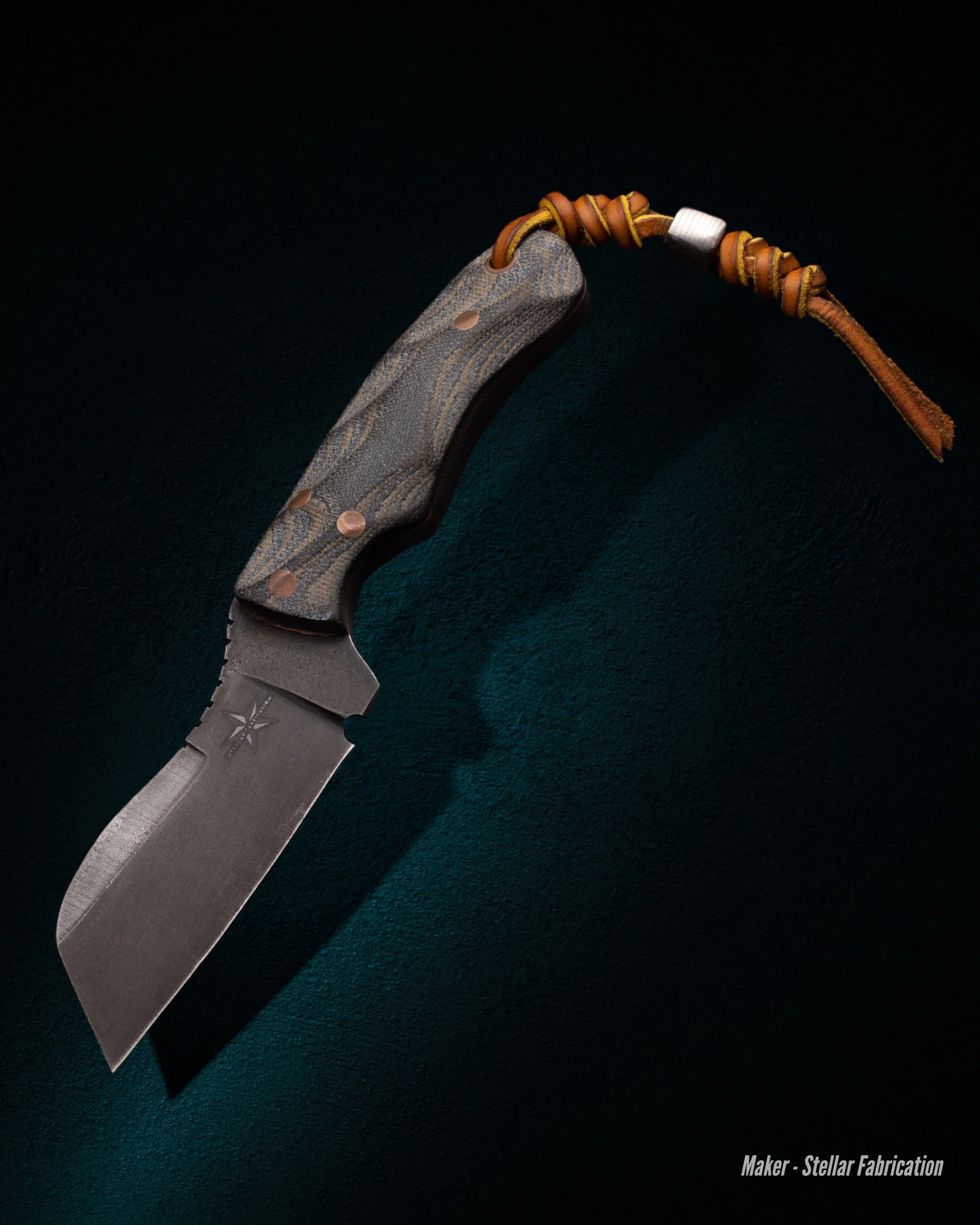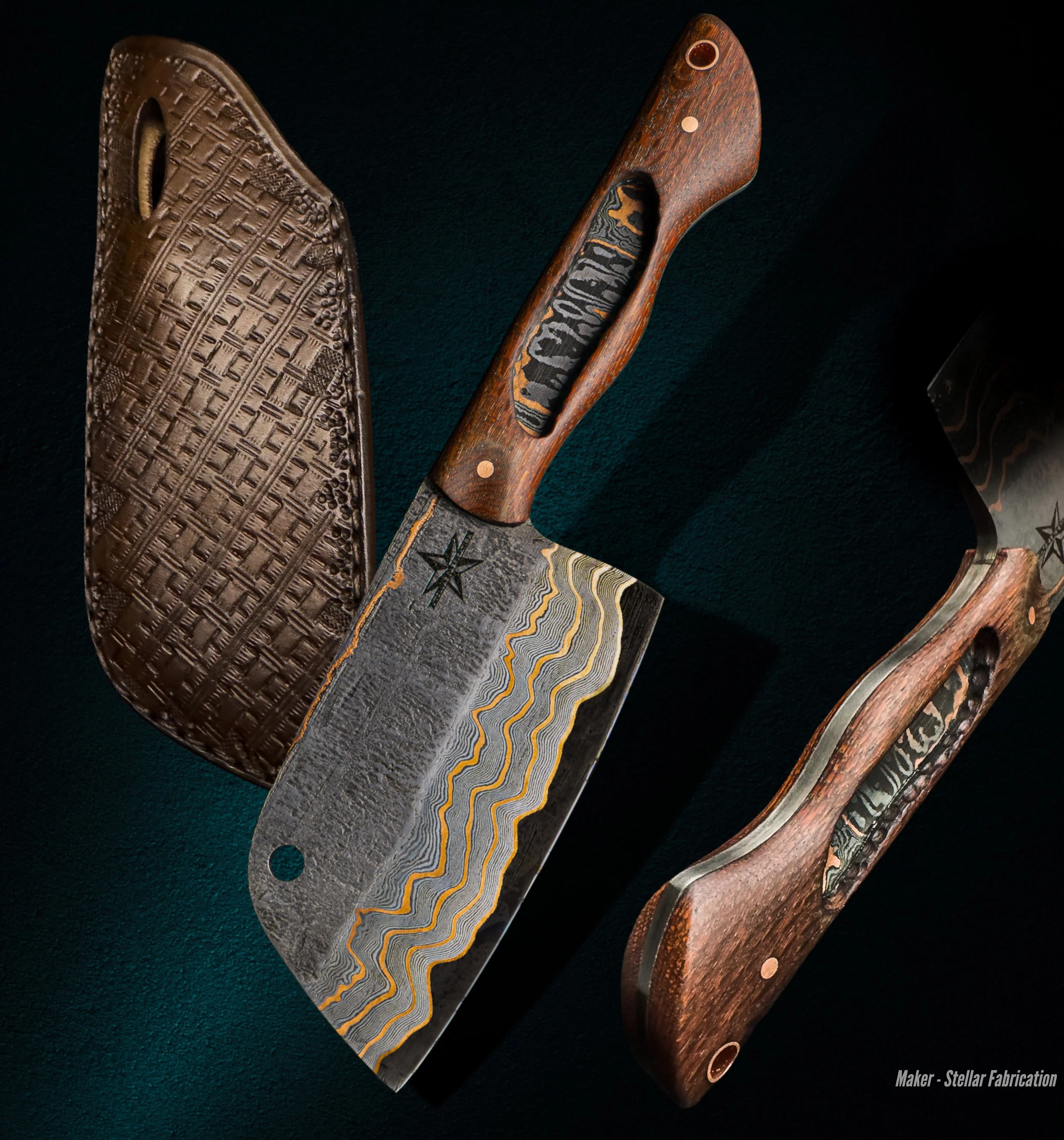 Trinity Barger “Coppa Choppa” leather, laminated steel consisting of 80CrV2, 15N20, 8670, and copper; lacewood 8.75” x .625” x 2.25” 2022 1.